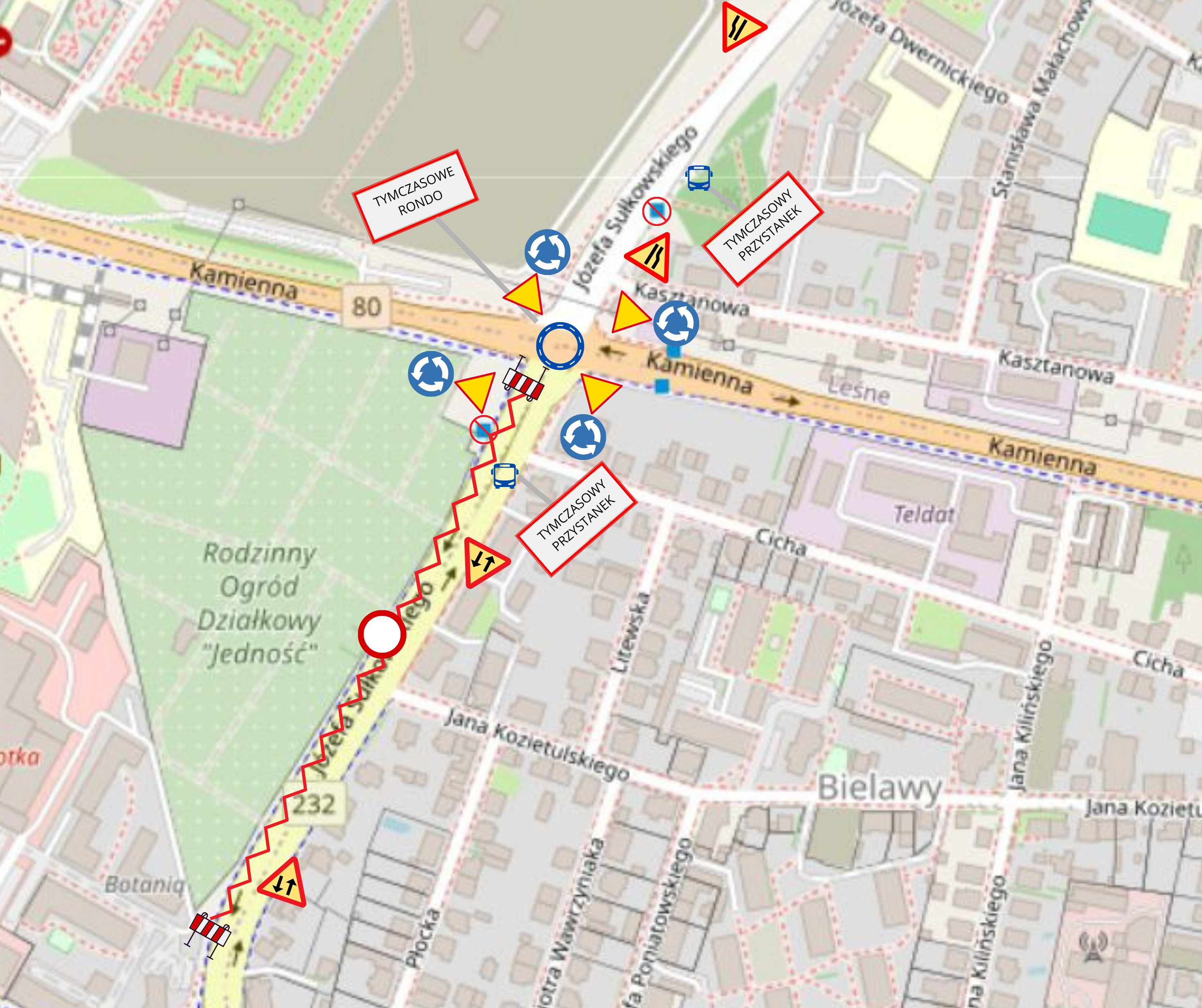 Zaplanowane prace wymagają wprowadzenia zmian w organizacji ruchu. Od 04.10. (sobota) na skrzyżowania ulic Kamiennej oraz J. Sułkowskiego powstanie tymczasowe rondo, a w zależności od etapu robót, ruch na odcinku od ul. Kamiennej do ul. Chodkiewicza, będzie prowadzony po wschodniej lub zachodniej jezdni ul. J. Sułkowskiego. W pierwszym zamknięta dla ruchu będzie jezdnia prowadząca w stronę ulicy Chodkiewicza. Zawężone zostaną również skrajne pasy ulicy J. Sułkowskiego od tymczasowego ronda w kierunku dworca Bydgoszcz Leśna. Wprowadzone zostanie także ograniczenie prędkości do 30km/h.