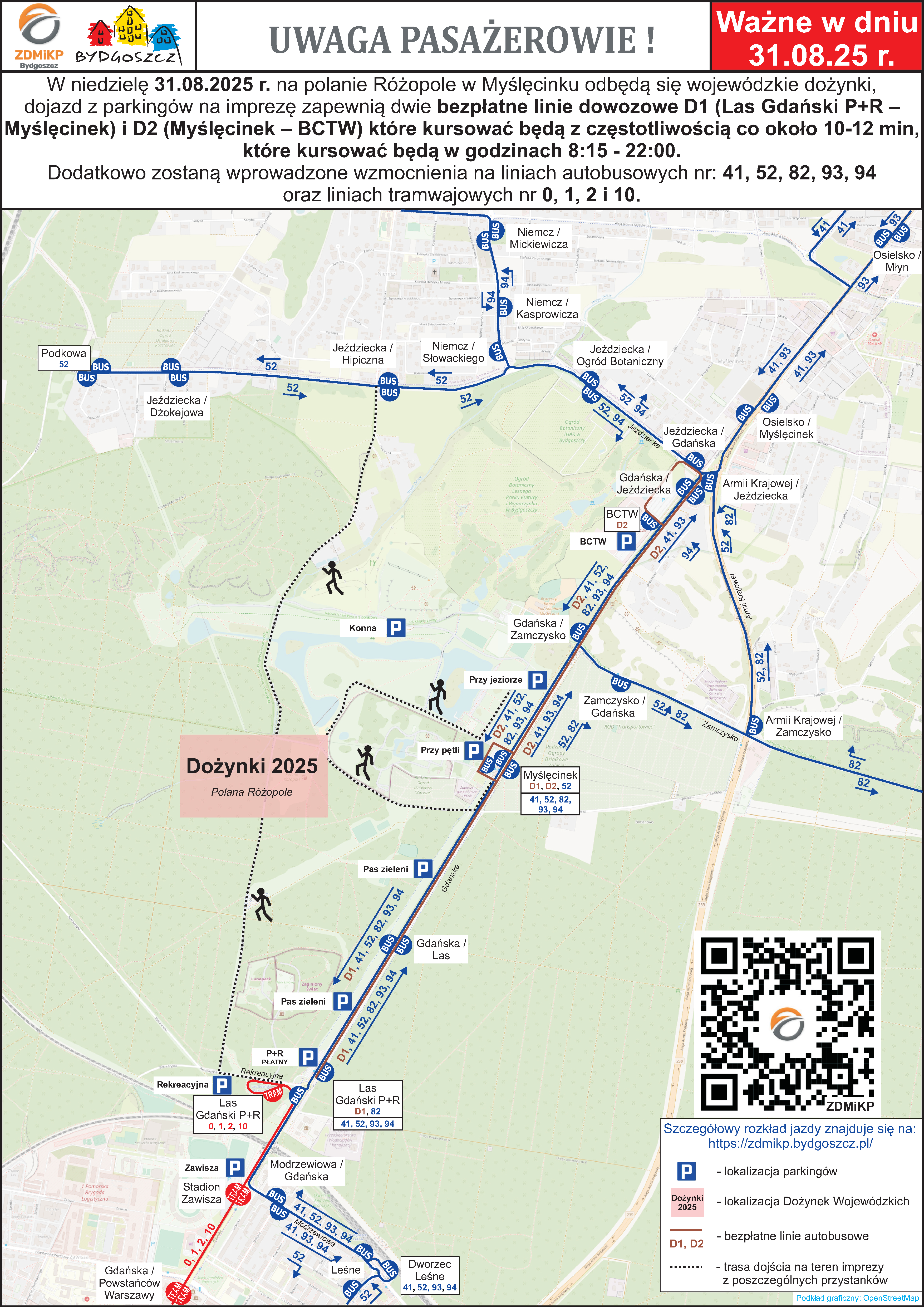 Na czas imprezy uruchomione zostaną dwie bezpłatne linie autobusowe, które kursować będą z częstotliwością co ok. 10-12 minut. Zapewnią dojazd z parkingów do pętli Myślęcinek, znajdującej się blisko Różopola, gdzie skupią się imprezy dożynkowe.