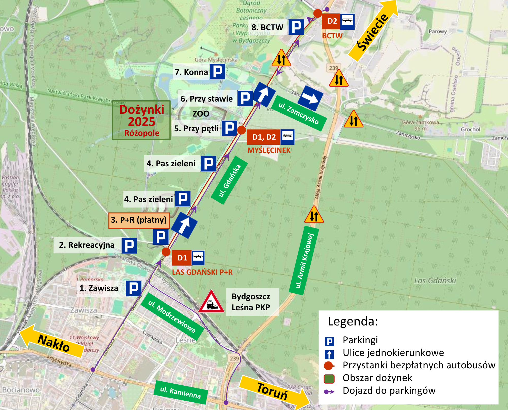 W niedzielę (31 sierpnia) na polanie Różopole w Leśnym Parku Kultury i Wypoczynku w Bydgoszczy odbędą się wojewódzkie dożynki. Zachęcamy do zapoznania się z tymczasową organizacją ruchu, która ułatwi dojazd i parkowanie podczas wydarzenia.