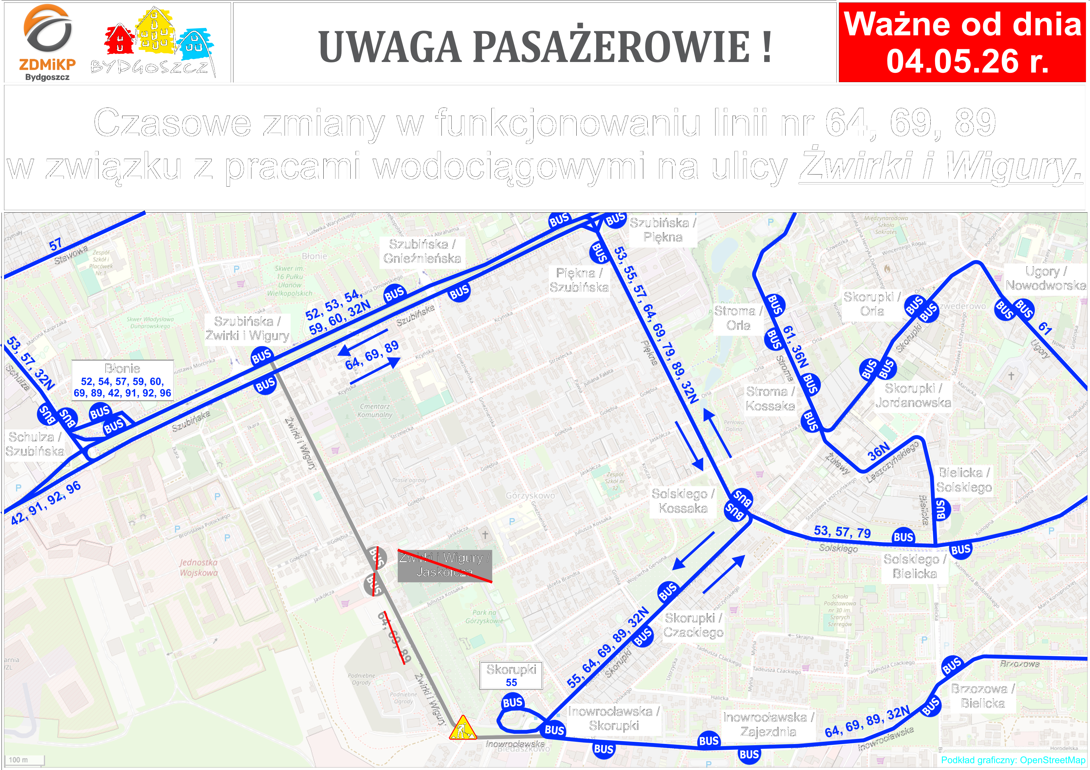 Od 04.05.2026 r. (poniedziałek) w związku z pracami budowlanymi prowadzonymi na zlecenie MWiK planowane jest zamknięcie dla ruchu kołowego ul. Żwirki i Wigury, w związku z czym zmianie ulegną trasy przebiegu linii autobusowych nr 64, 69 oraz 89.