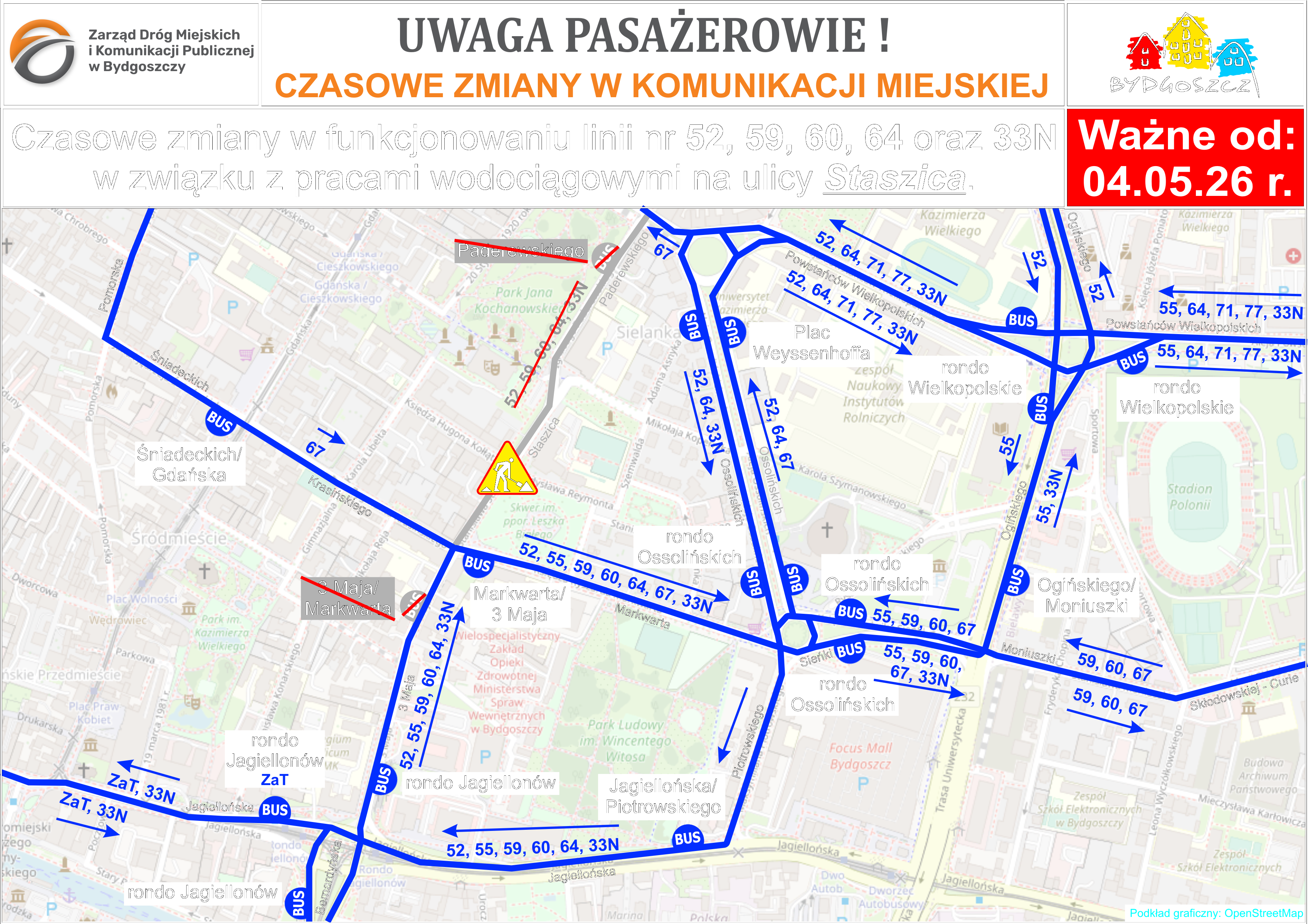Od 04.05.2026 r. (poniedziałek) w związku z pracami budowlanymi prowadzonymi na zlecenie MWiK planowane jest zamknięcie dla ruchu kołowego ulicy Staszica, w związku z czym zmianie ulegną trasy linii autobusowych nr 52, 59, 60, 64 oraz 33N.