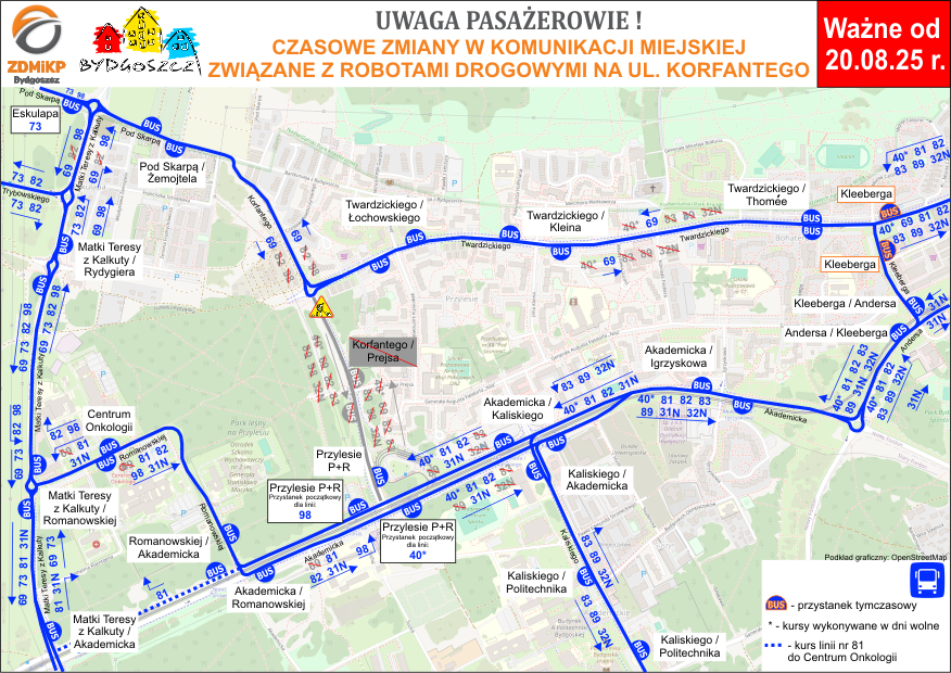 W środę (20.08.2025) rozpoczyna się wymiana nawierzchni na ul. W. Korfantego na odcinku pomiędzy ulicami J. Prejsa i J. Twardzickiego. W związku z prowadzonymi pracami linie autobusowe numer 69, 82, 83, 89, 98, 32N oraz 40 pojadą zmienionymi trasami.