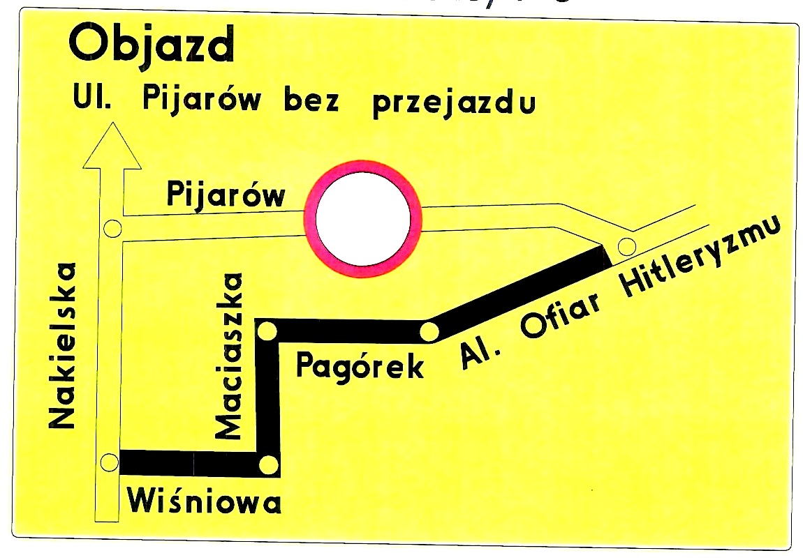 Wykonawca tytułowej inwestycji od dnia 23.07.2018 r. planuje rozpocząć prace w ramach zadania pn.: "Budowa ulicy Pijarów w Bydgoszczy w systemie zaprojektuj i wybuduj." W związku z tym, od: 23.07.2018 r. wprowadzi tymczasową organizację ruchu, która zakłada zamknięcie ulicy Pijarów od strony ulicy Nakielskiej. Dojazd z Alei Ofiar Hitleryzmu do ulicy Nakielskiej zostanie poprowadzony objazdem przez ulice Wiśniową, Maciaszka i Pagórek (zgodnie z załączonym niżej schematem).