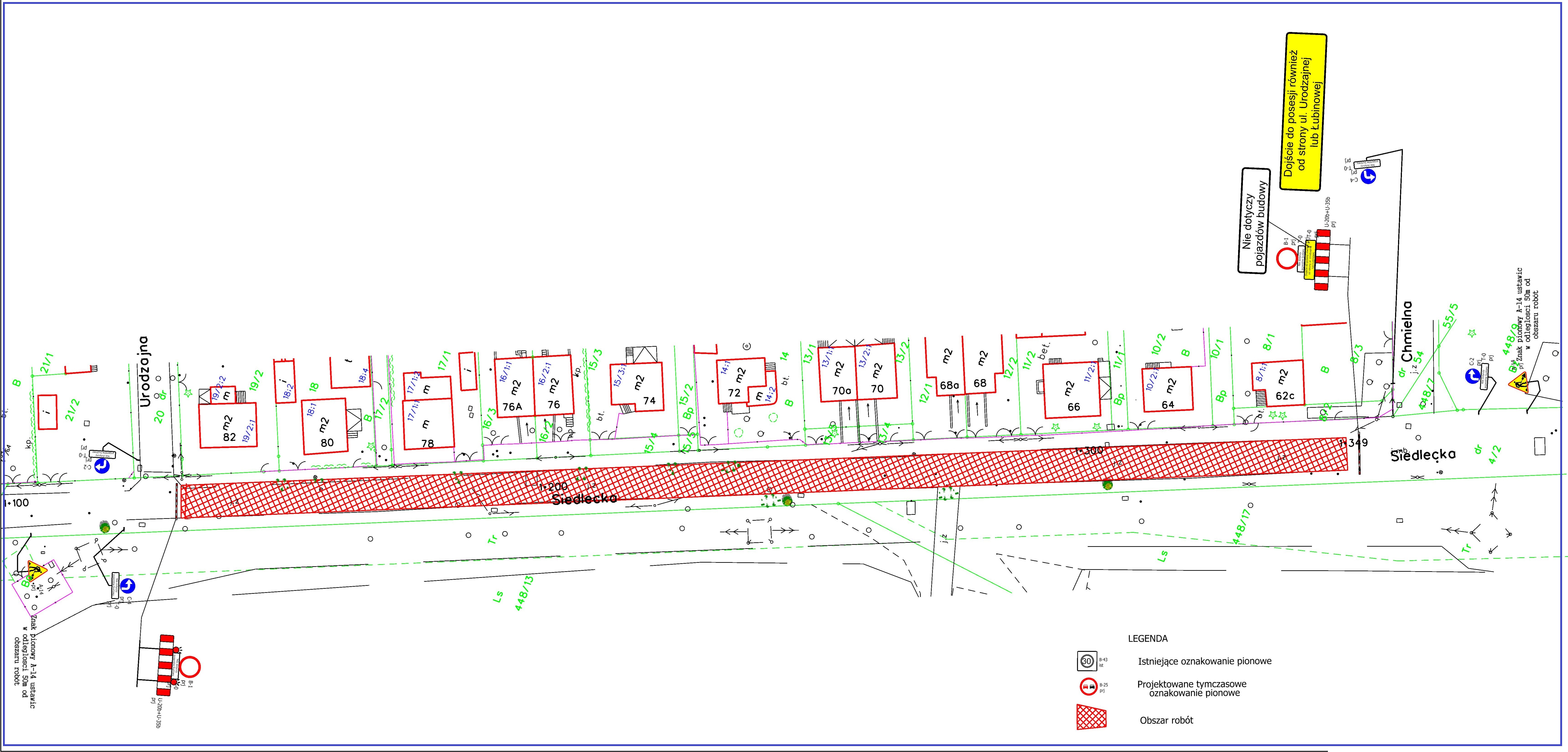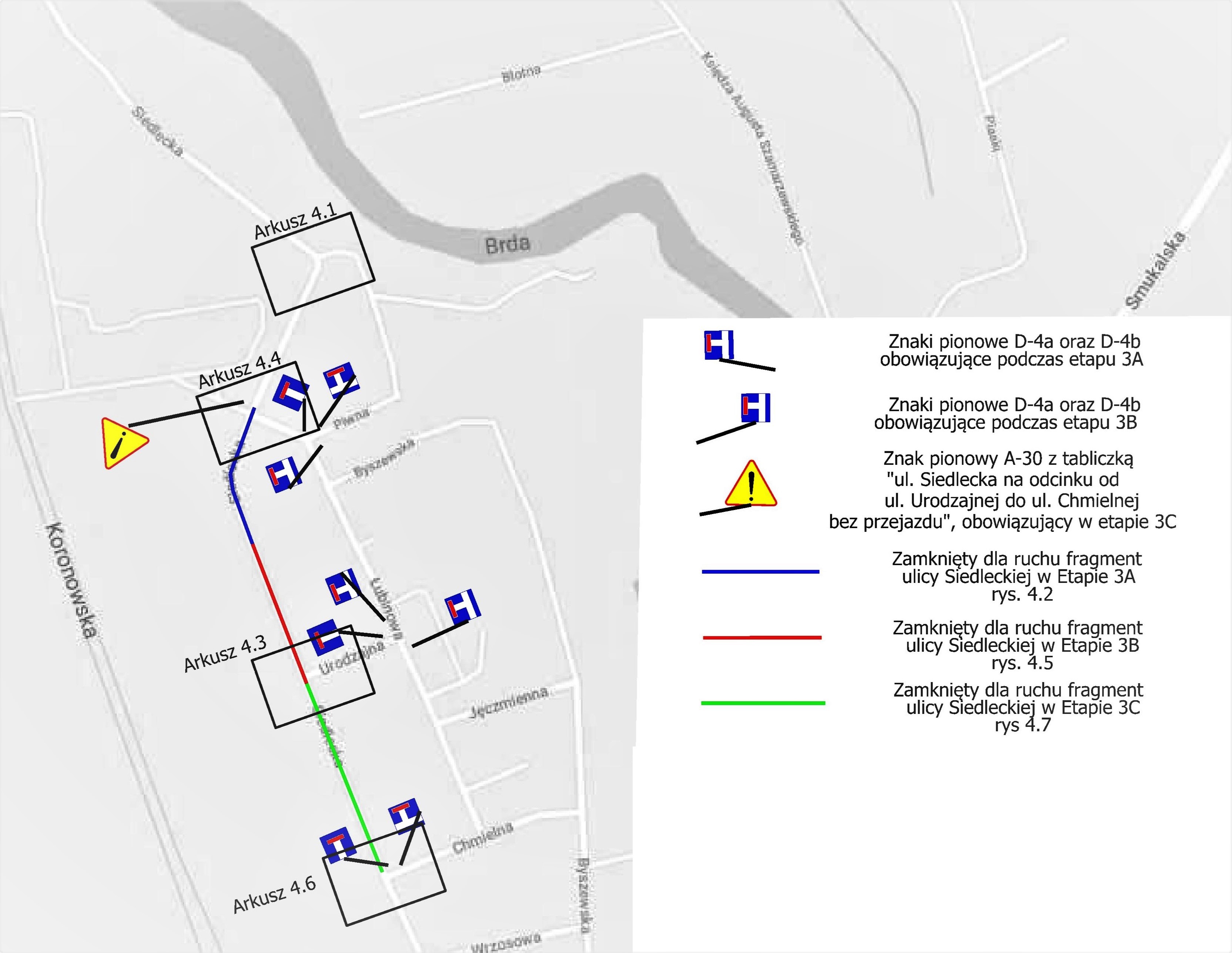 Wykonawca prac - firma Budowlano-Drogowa "PRASBET" od 10.06. planuje rozpocząć budowę. Tego dnia zainicjuje prace przygotowawcze w ramach realizacji zadnia: "Budowa ul. Siedleckiej w Bydgoszczy na odcinku od ul. Koronowskiej do ul. Chmielnej." W związku z tym, od 11.06. (wtorek) wprowadzi tymczasową organizację ruchu na odcinku ul. Siedleckiej od ul. Chmielnej do ul. Łubinowej. Prace będą podzielone na podetapy: wykonawca rozpocznie roboty związane z budową sieci kanalizacji deszczowej od skrzyżowania z ul. Chmielną i będzie realizował kolejne etapy w kierunku skrzyżowania z ul. Koronowską. Wyłączony z ruchu odcinek ulicy oraz poszczególne etapy robót zostały zobrazowane w załącznikach.