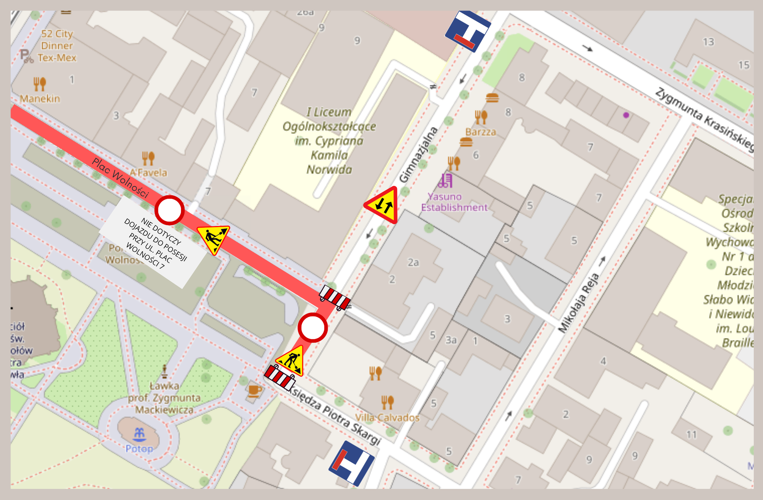 W środę (19 listopada) zamknięta dla ruchu kołowego zostanie ulica Gimnazjalna na odcinku od ul. Plac Wolności do ul. Ks. Piotra Skargi. Na jej pozostałym odcinku zostanie wprowadzony ruch dwukierunkowy. Taka organizacja ruchu wymusza tymczasowe zlikwidowanie miejsc postojowych wzdłuż tej ulicy.