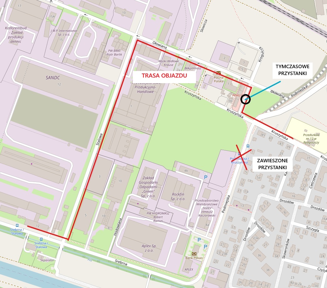 Od piątku (10 kwietnia) linie autobusowe numer 77 oraz 35N zostały skierowane objazdem ulicami  Kruszyńską - Krogulczą – Ołowianą – Stalową – Srebrną (w obu kierunkach). Przystanek pn. Podmiejska/Kruszyńska został czasowo dyslokowany na ulicę Krogulczą.