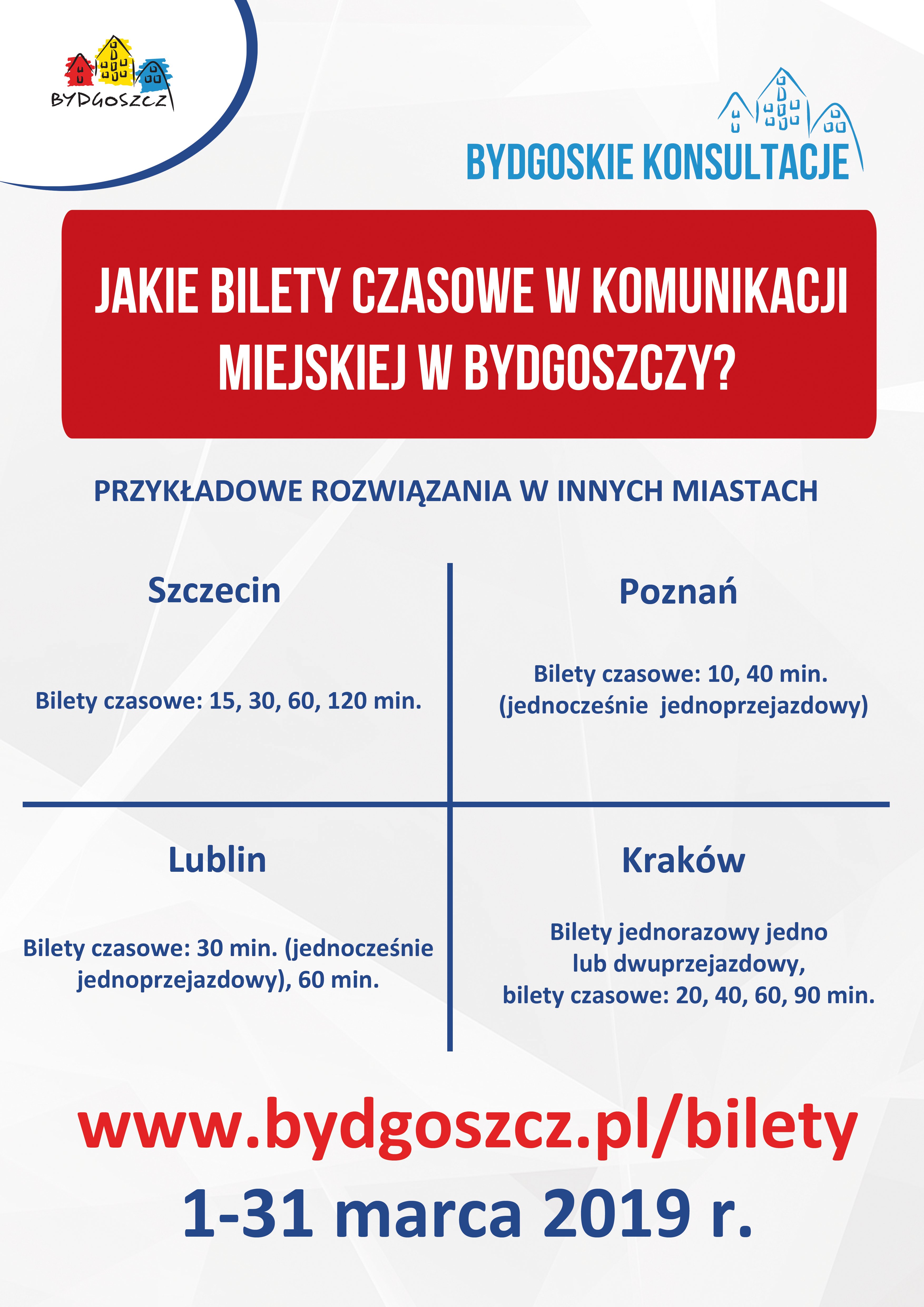 Od 01. marca do 31. marca będą prowadzone konsultacje społeczne dotyczące wprowadzenia biletu czasowego w komunikacji miejskiej. Celem konsultacji jest pozyskanie, jak największej liczby informacji dotyczących podróży. Liczby przejechanych przystanków, przesiadek. Zebranie informacji pozwoli na przygotowanie najlepiej dostosowanej oferty do oczekiwań Pasażerów.